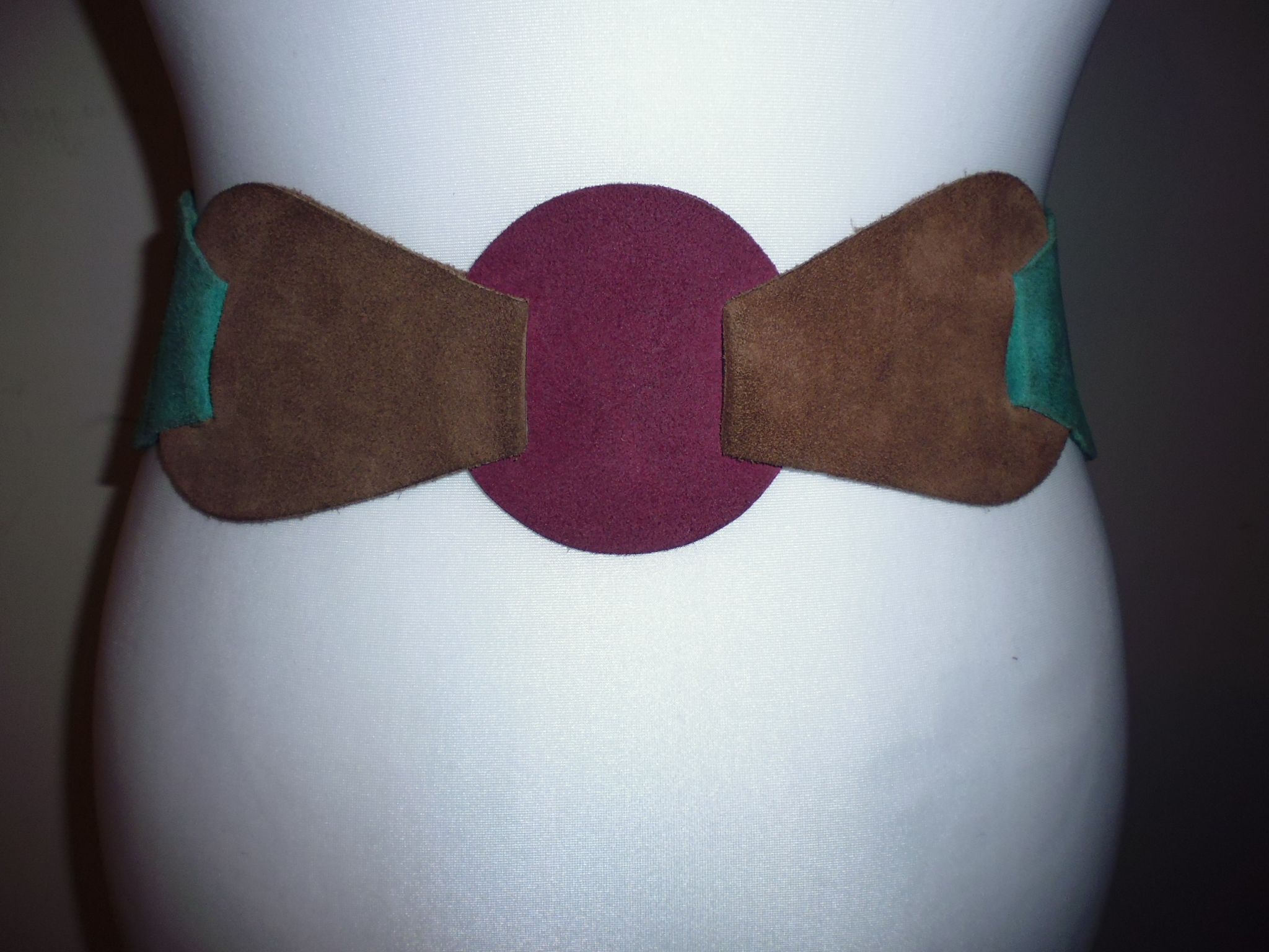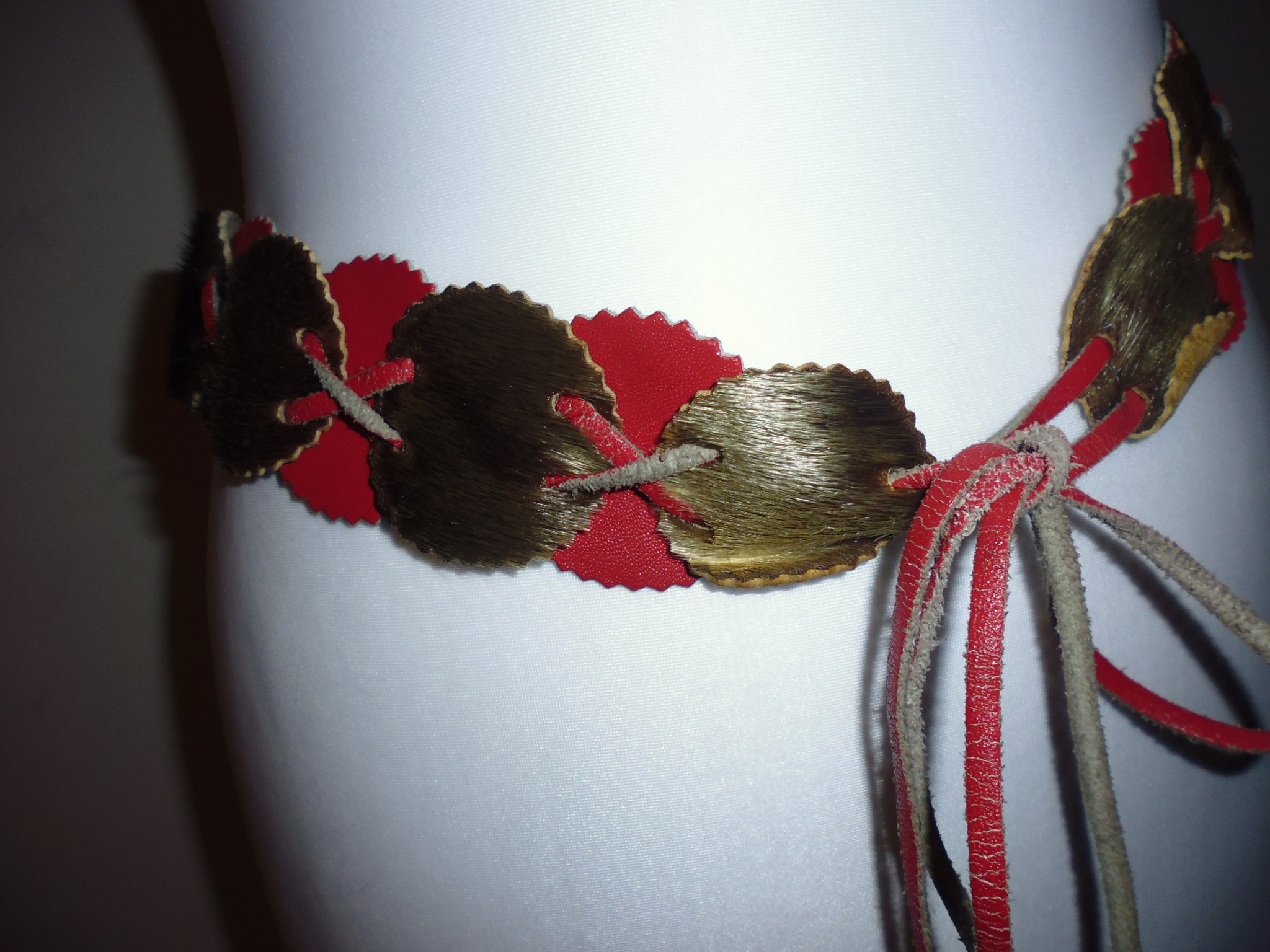 This belt is a little more complicated, made from alternating discs of red leather and fur (I think rabbit), held together by cris-crossed leather laces.