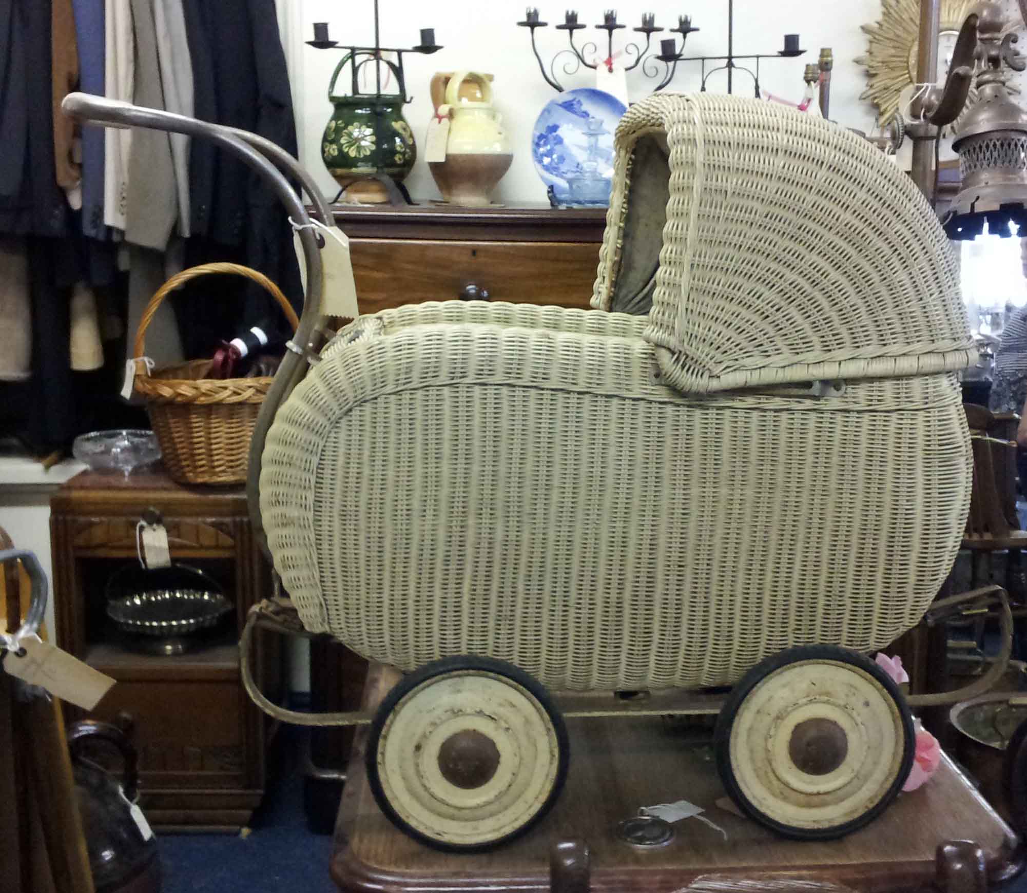 A toy pram made from woven material, a bit like a Lloyd Loom chair, but I couldn’t find any label to confirm my suspicion that they made it.